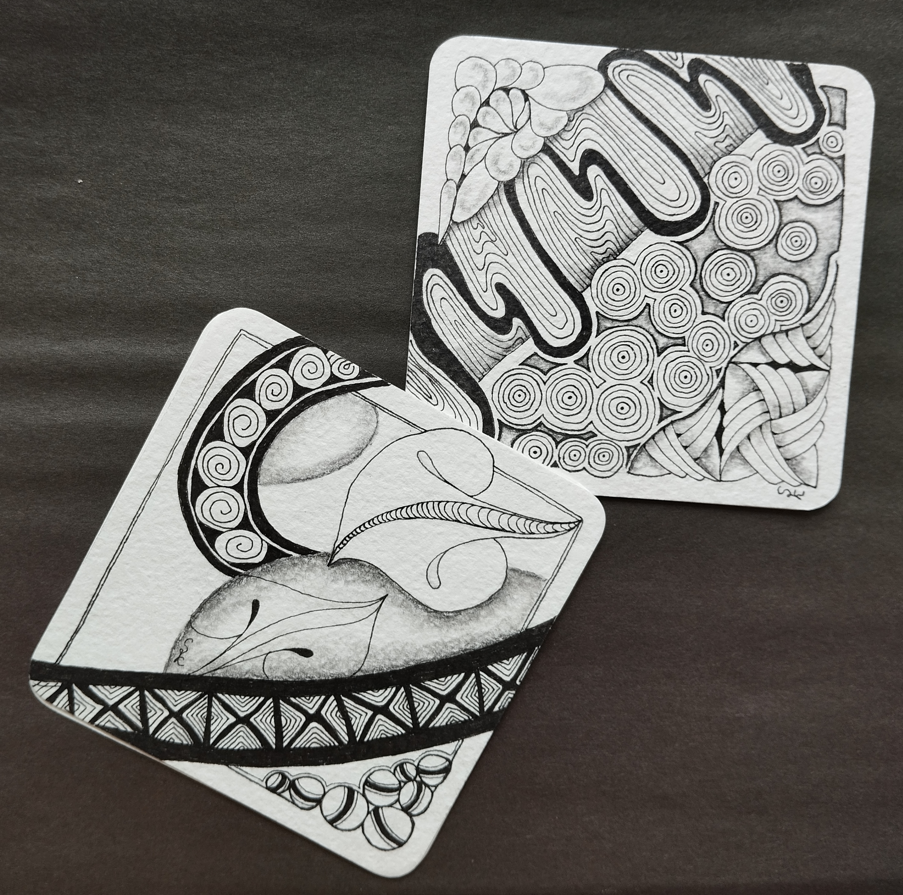 На последней встрече клуба раздавали плиточки АТС с уже нарисованным танглом. Задача была дополнить. По-моему получилось вполне гармонично. Я, правда, забыла сфотографировать плиточку "до"(